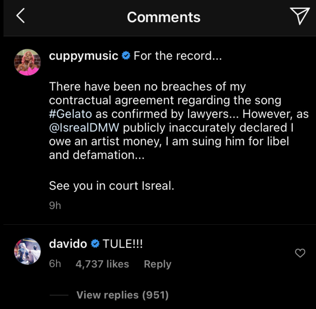 Davido who is the boss of Israel DMW, took to the comment section of DJ Cuppy to sarcastically mock her intention of suing his client. In reaction, O.B.O penned his trending catchphrase, ”Tule” in reply to the disc jockey’s lawsuit.
