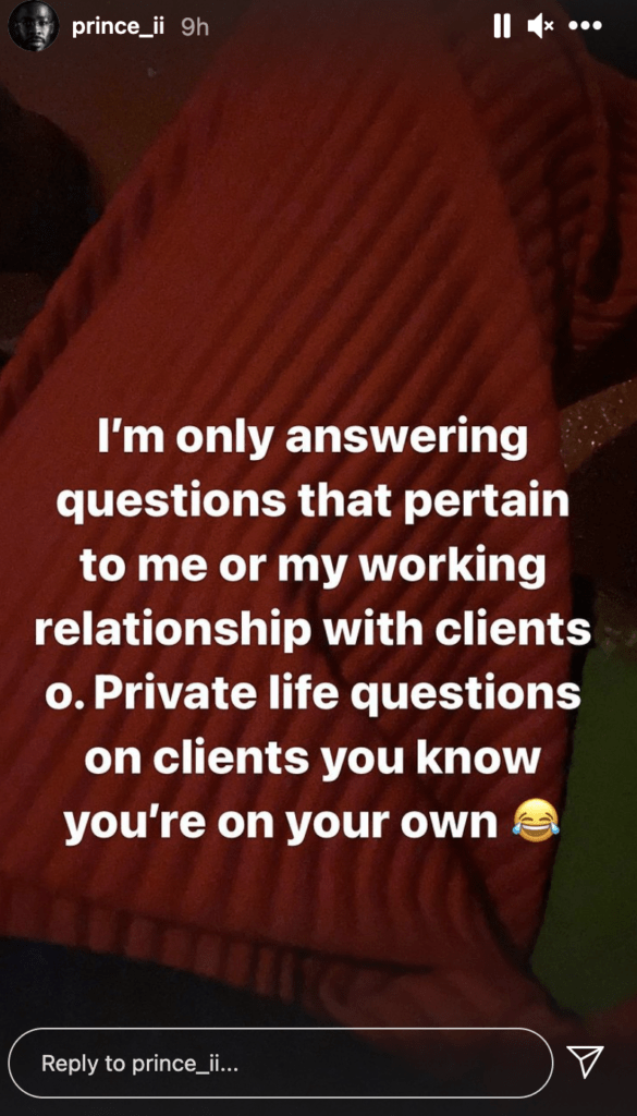 According to him, he only answers questions related to him or his experiences working with his clients however, he has no right to comment about the private lives of his clients hence, he cannot answer any question related to Davido and Chioma’s issues.