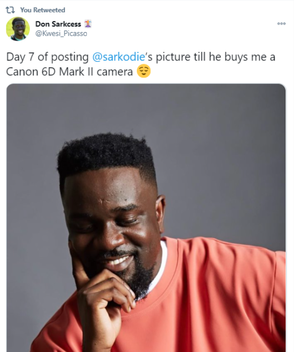 One delusional member of SarkNation identified as Kwesi Picasso on Twitter says he’s posting photos of Sarkodie till he buys him a Canon 6D Mark II camera.