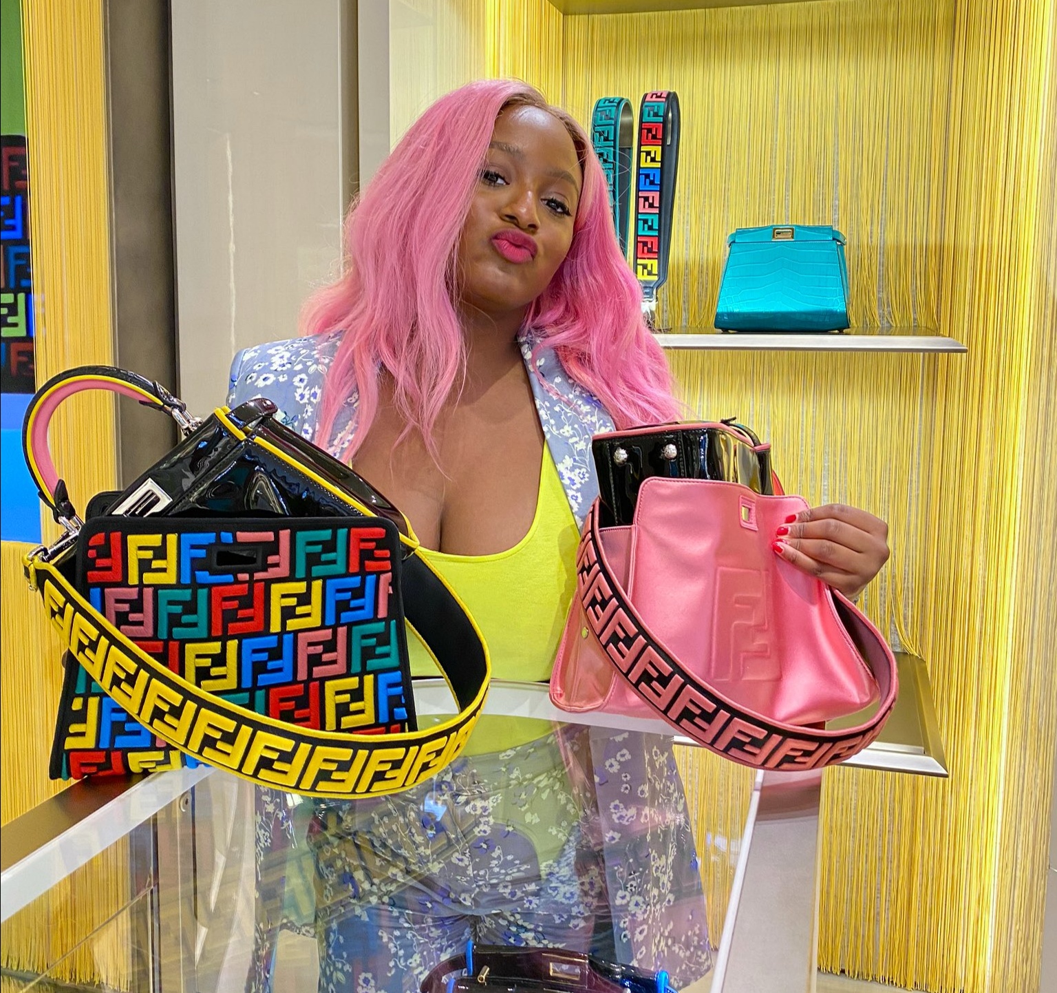 Cuppy, who is a big fan of designer brand Fendi, was making posts every week, rocking fending everything from outfits to shoes, bags, caps ect.