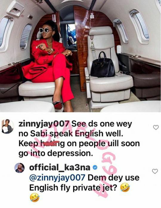 The former Big Brother Naija season five housemate took to her official verified Instagram handle and shared a photo of herself inside a private jet and a lady identified as @zinnyjay007 took to the comment section and trolled her by saying she doesn’t know how to speak English very well but keeps hating on people and she will soon go into depression before she realizes how far she has gone.