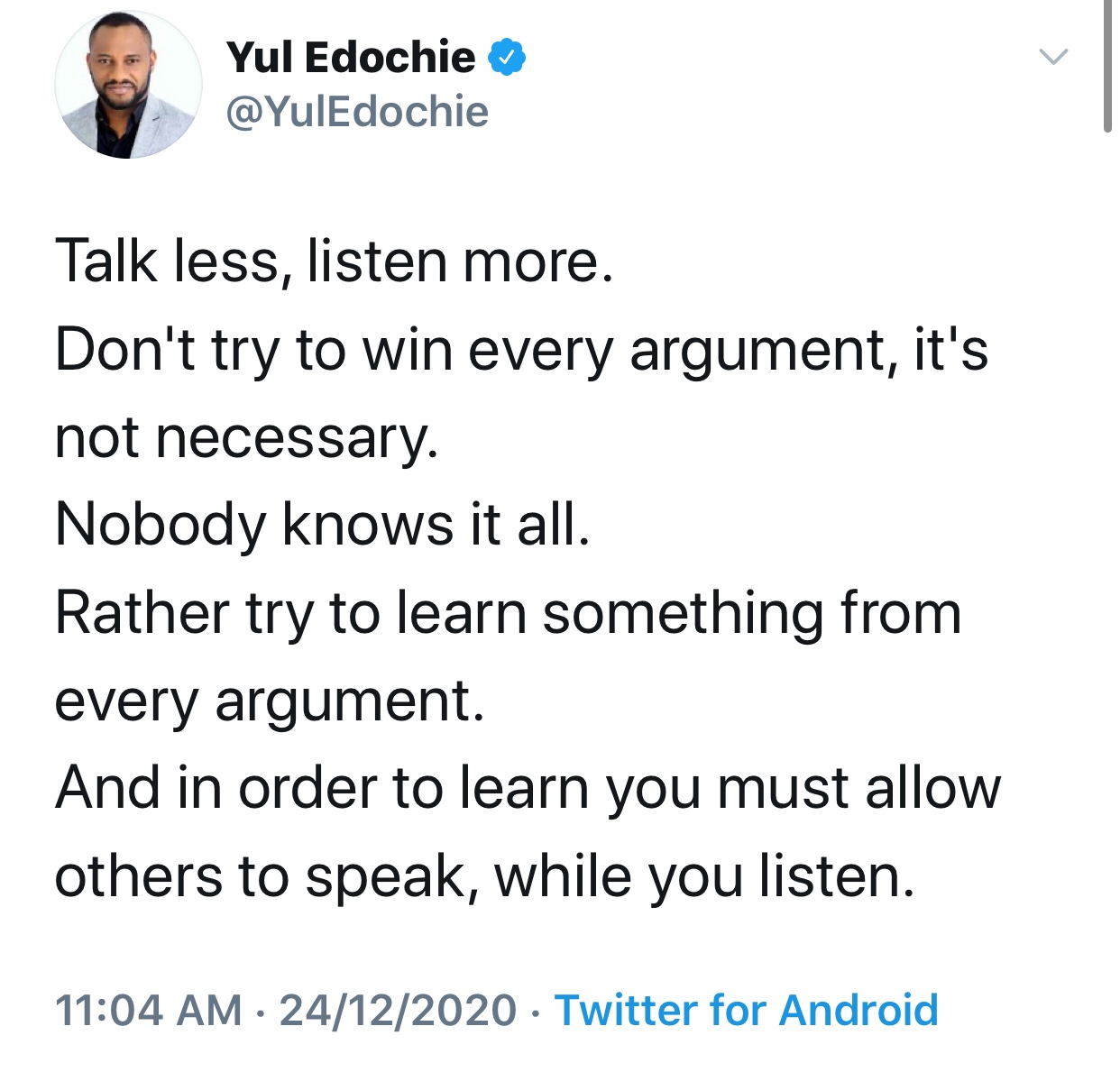 Yul Edochie has taken to social media to advise her fans and followers that it is unnecessary for one to always win every argument.