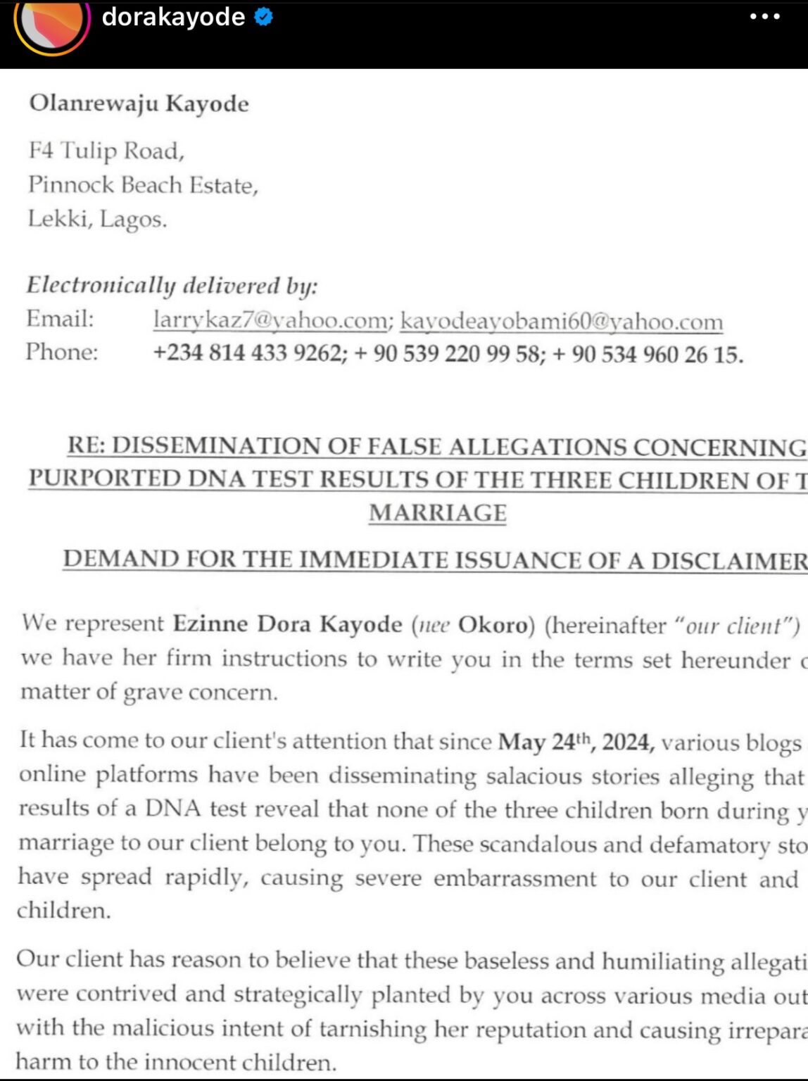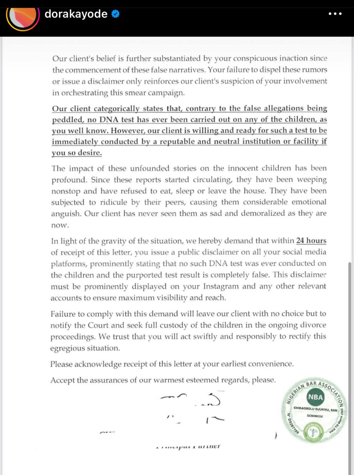 In response, Dora issued a cease and desist letter to her husband, urging him to halt the spread of false rumors.
