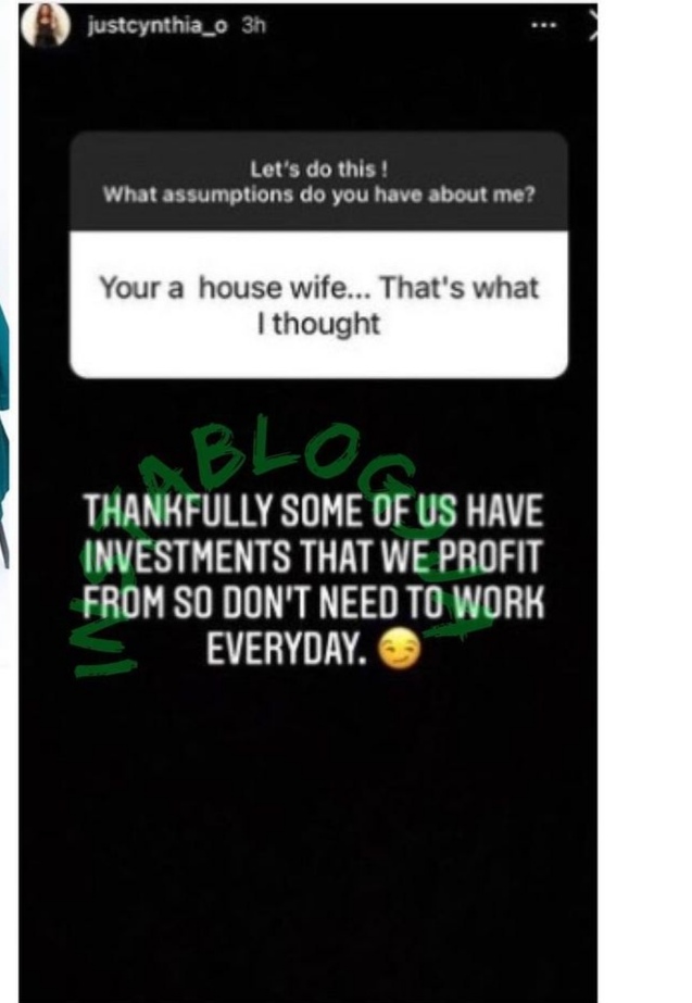Cynthia said this while responding to fans after she asked them to tell her some assumptions they have about her to which a fan said, they had assumed she was a housewife.