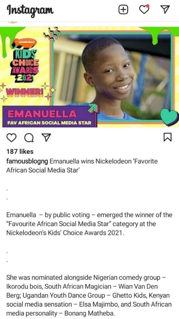 Young Nigerian comedian, Emmanuella, has emerged as the winner of the Favorite African Social Media Star at the Nickelodeon Kid’s Choice awards.