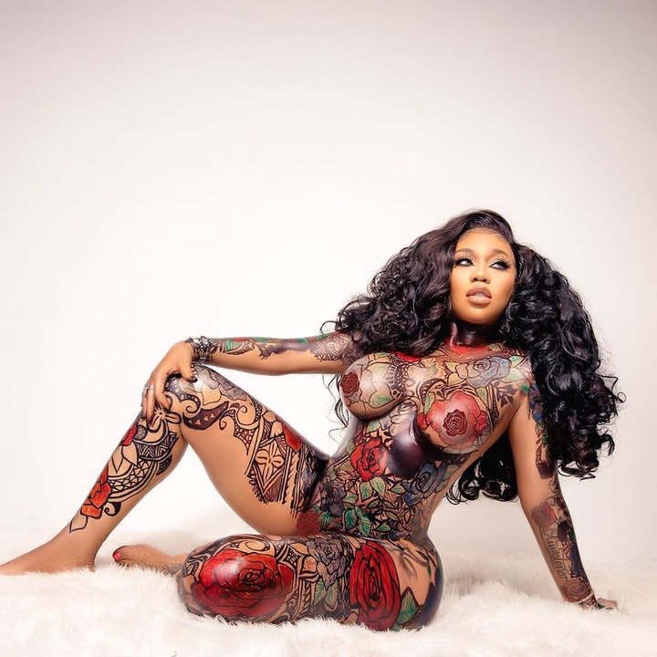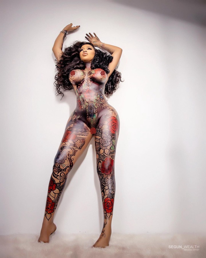 Celebrating the happiest day in her, the curvaceous stylist took to her verified Instagram page to share gorgeous photos of herself in a unique art of tattoos on her body. Toyin Lawani in these photos wears nothing except the tattoos inscribed on her sultry skin.
