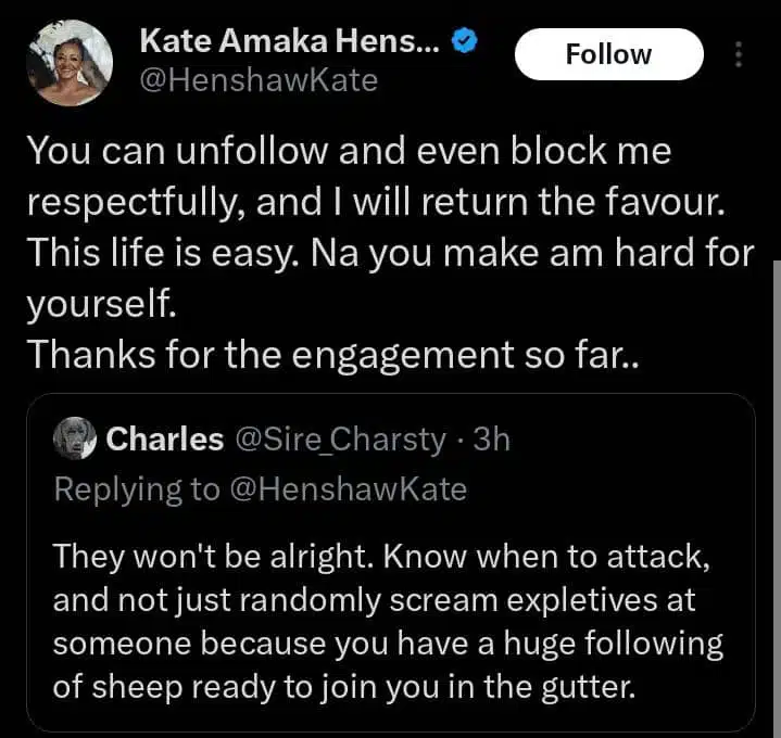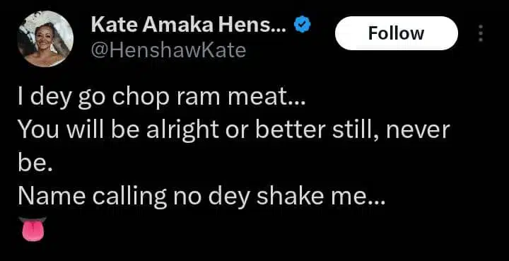 In response to the trolls, the actress wrote: “I dey go chop ram meat… You will be alright or better still, never be. Name calling no dey shake me…👅”