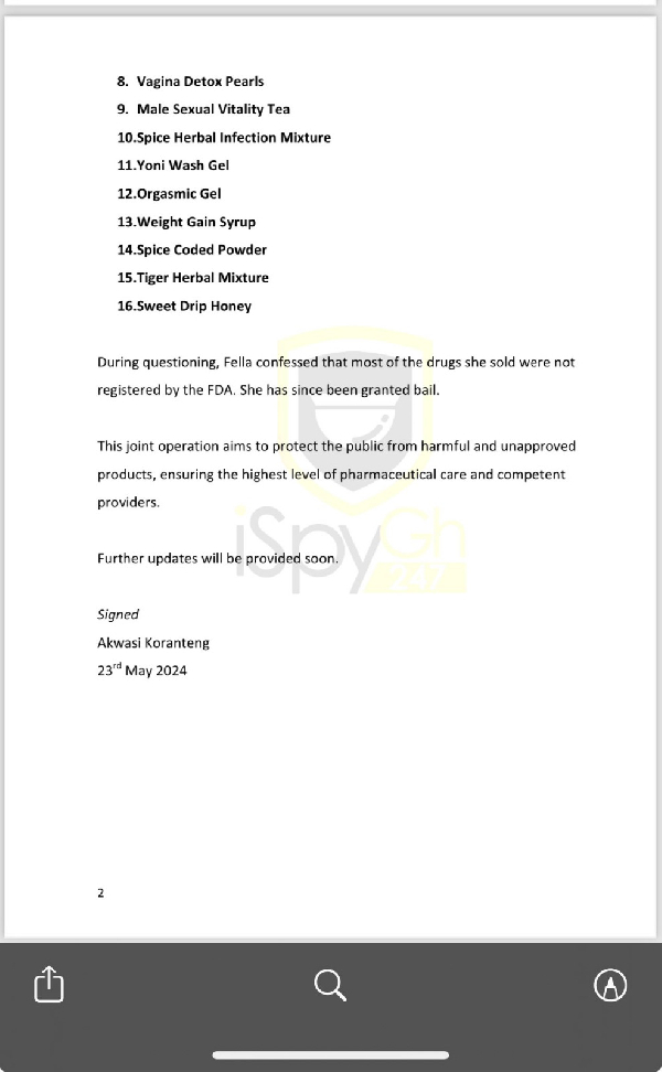 During interrogation, Makafui admitted to selling non-FDA-registered drugs. She has since been granted bail pending further investigation.