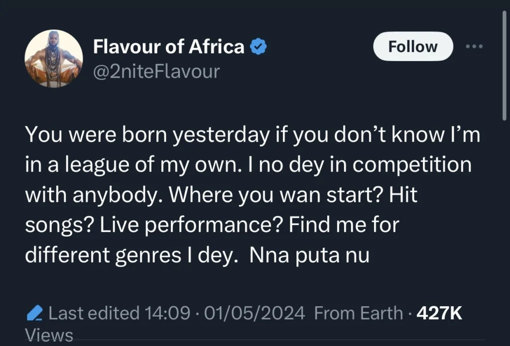 While several musicians have chosen to stay silent on the controversy, Flavour recently shared his perspective on social media. He expressed confidence in his unique position in the music world, stating that he doesn’t see himself in competition with anyone.