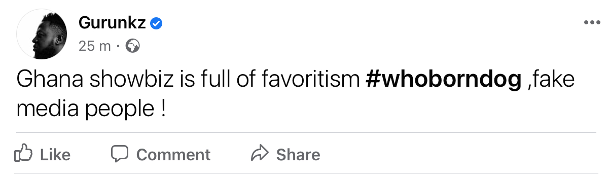 The ”Who Born Dog” hitmaker angrily took to his Facebook page to display his displeasure about things happening in the showbiz business. Guru’s message comes shortly after Shatta Wale and Samini launched a new beef.