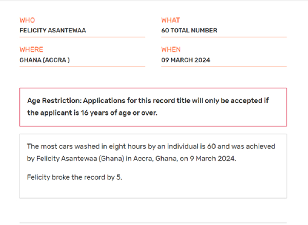 On March 9, 2024, in Accra, Felicity washed 60 cars, surpassing the previous record by five cars. Her achievement was officially documented on the Guinness World Records website.