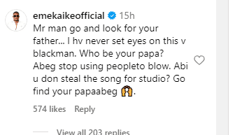Emeka Ike’s words were direct and unapologetic: “Mr man go and look for your father… l hv never set eyes on this v blackman. Who be your papa? Abeg stop using people to blow. Abi u don steal the song for studio? Go find your papa abeg”.