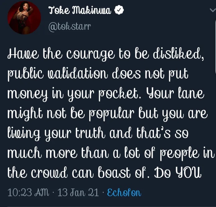 Media personality, Toke Makinwa, has sent out a word of advice to her followers.