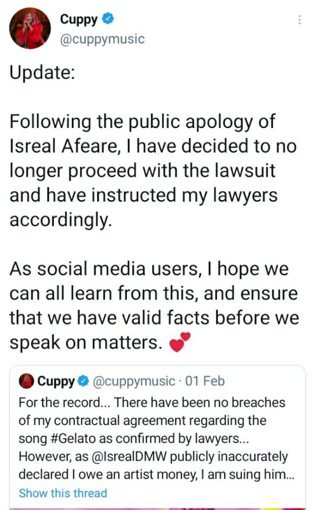A couple of days after the suit, Cuppy’s lawyer demanded Isreal to publicly withdraw the claim and apologize to her, which he obliged with a video, apologizing to her and her entire family.