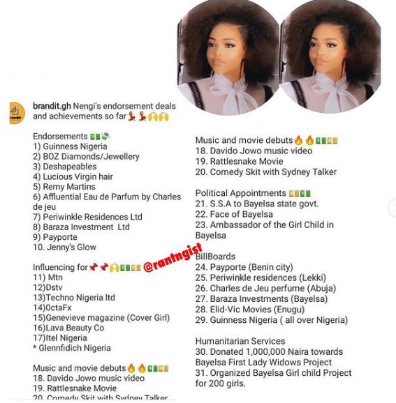 After the show, Nengi has signed many endorsements and ambassadorial deals with reputable companies across the country. Some of these companies include Guinness Nigeria, BOZ Diamonds/ Jewellery, Deshapeables, Jenny’s Glow, Payport and many others.