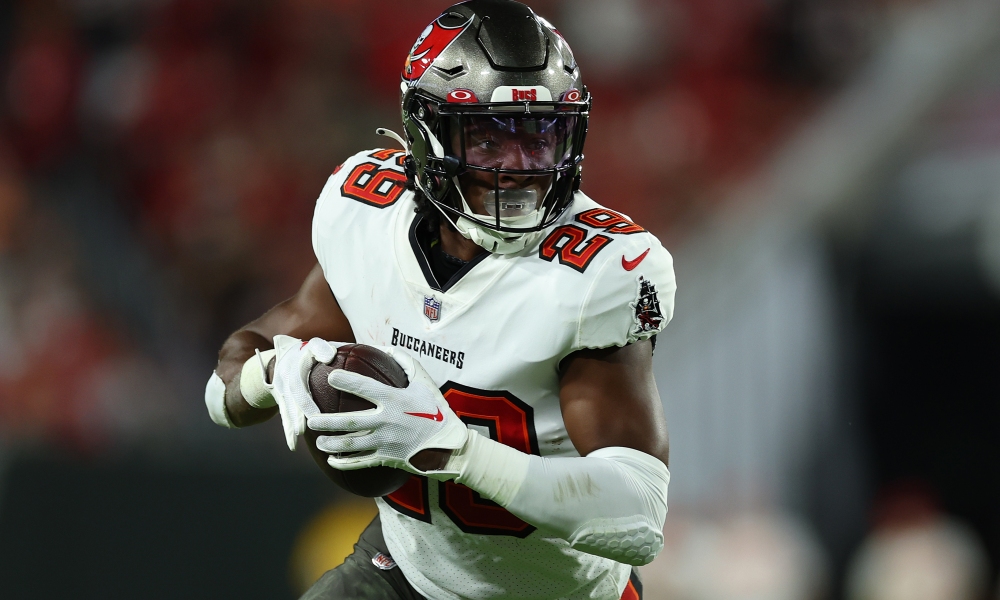 Rachaad White plays as running back for the Tampa Bay Buccaneers of the National Football League.