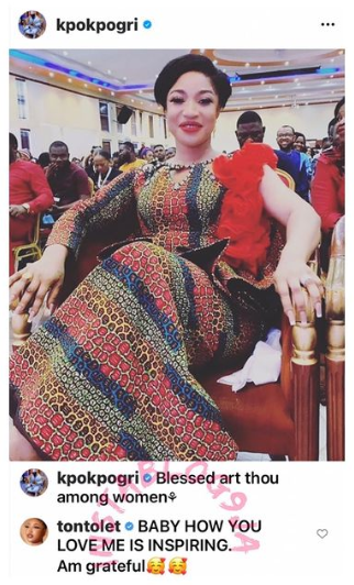 Prince Kpokogri shared a stunning photo of Tonto Dikeh on his Instagram page and stated that she is blessed amongst women. Reacting to the photo, Tonto took to the comment section and wrote, “BABY HOW YOU LOVE ME IS INSPIRING. AM GRATEFUL”.