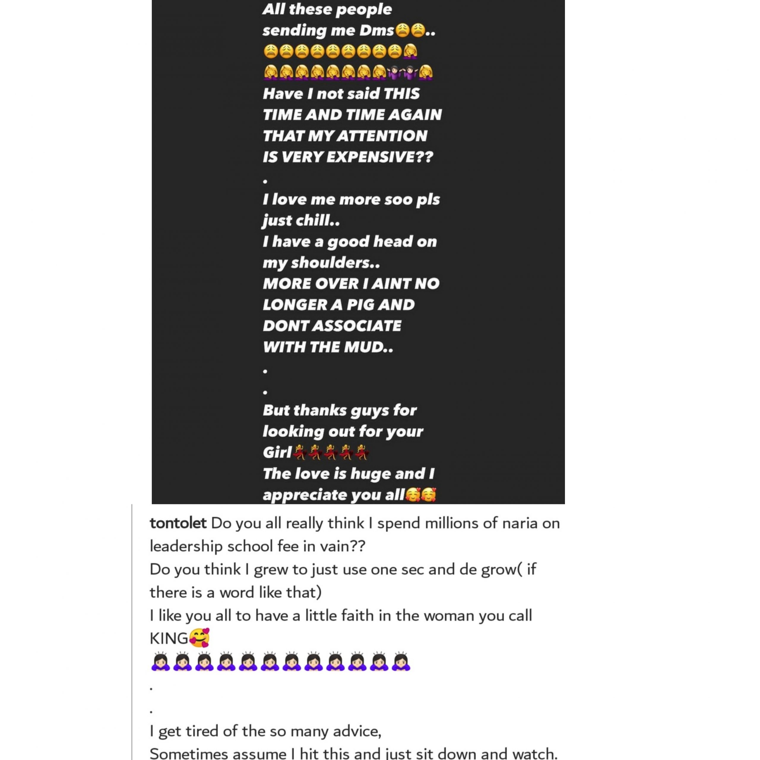 She said, she is no longer a pig and doesn’t associate with the mud adding that, she is not going to use just a second to ruin her growth.