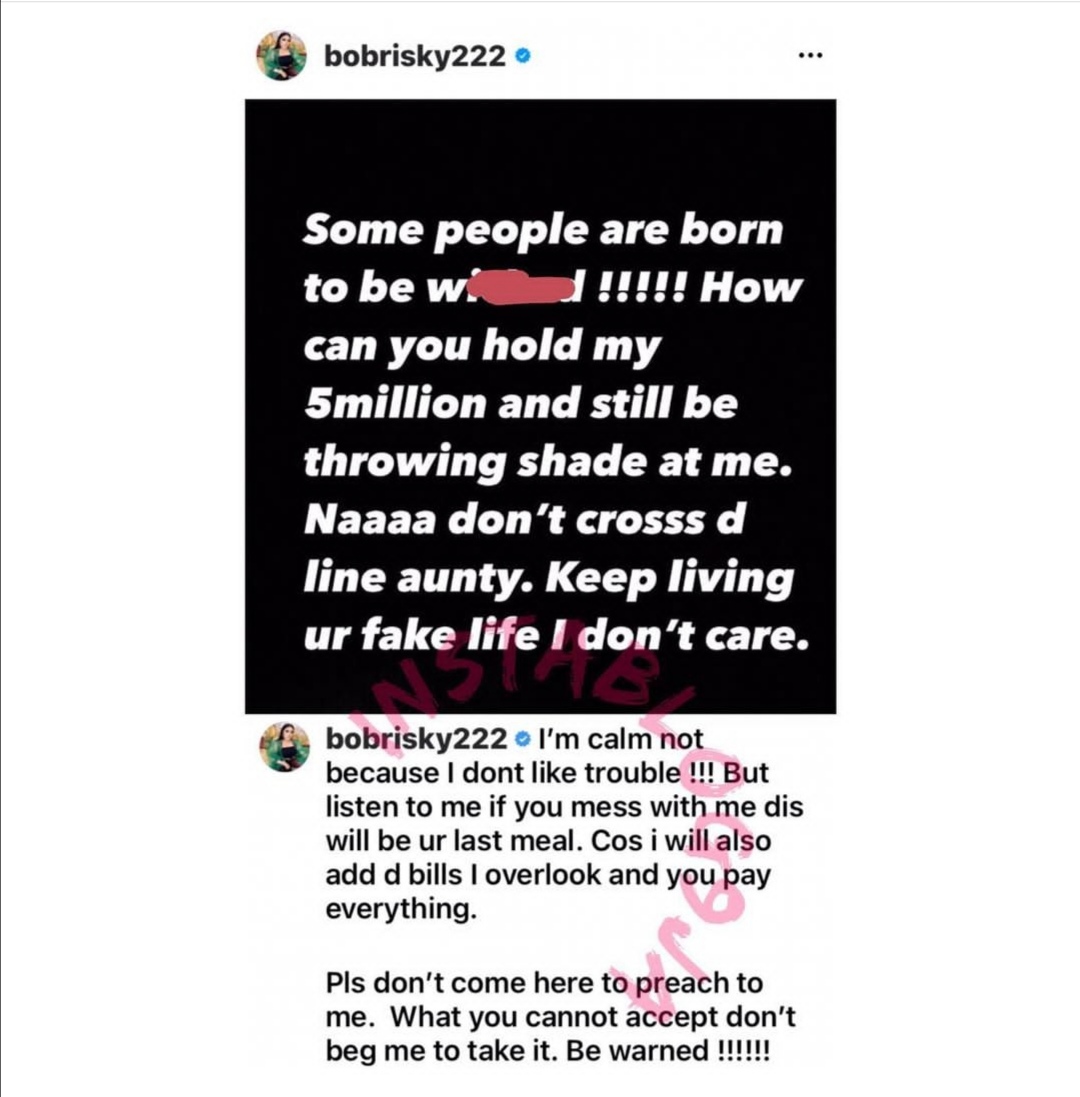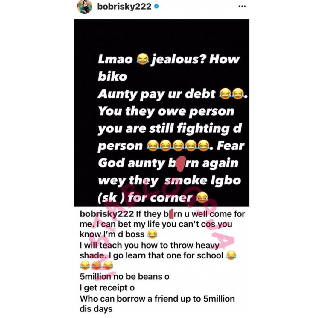 Bob Risky however took the post as a jab to her and reacted in a series of posts in her Instagram story, accusing Tonto of owing her N5million and urged her to pay her debt.