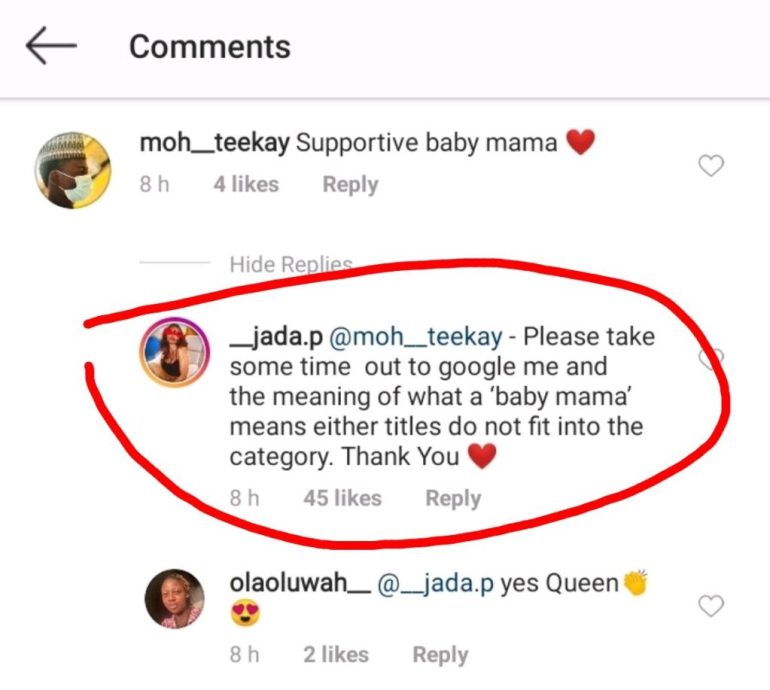 A fan identified as moh_teekay commented on Jada P’s post and referred to her as a supportive baby mama. Jada P who saw this post quickly asked the fan to desist from calling her such because she does not fit in that category.