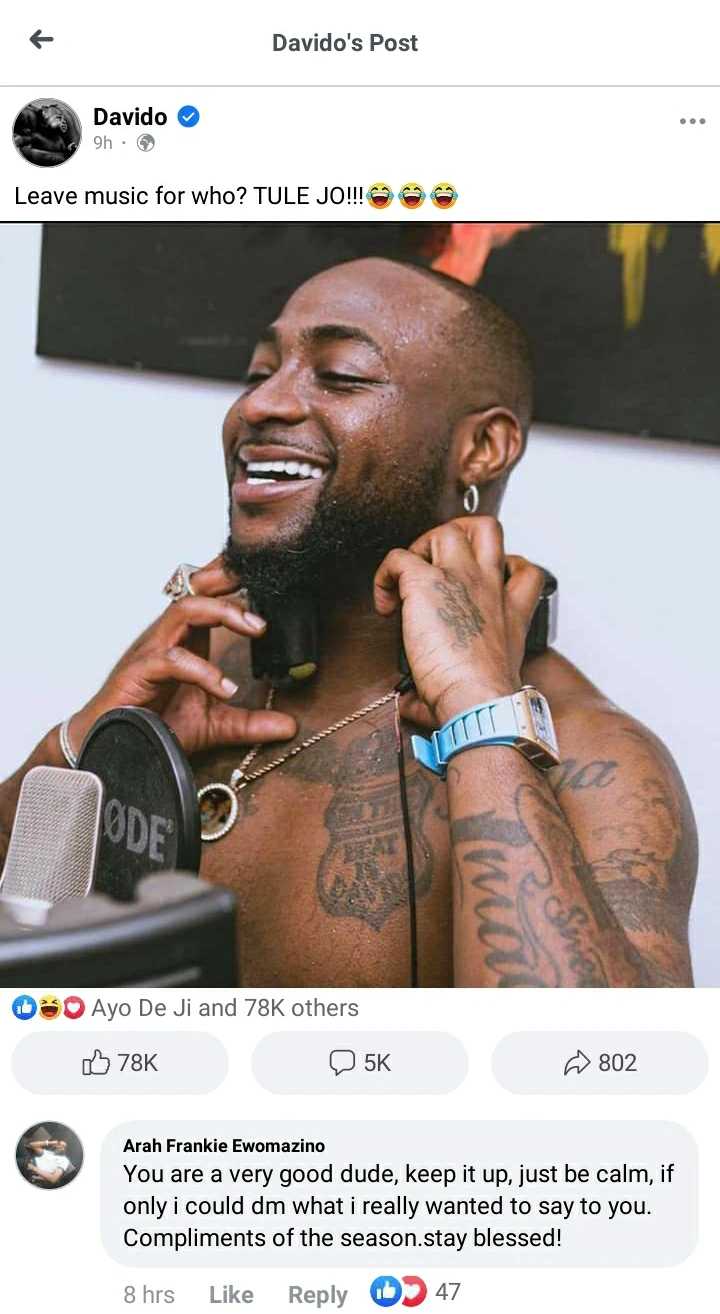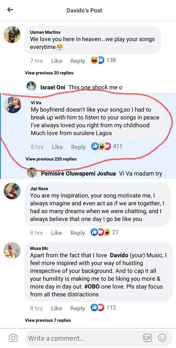 According to the lady identified on Facebook as Vivi, she has always loved David Adedeji Adeleke, better known as Davido, from childhood, and breaking up with his boyfriend was the only option she could enjoy the ‘Fem’ hitmaker music in peace.
