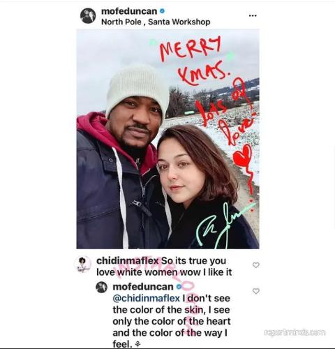 He was pushed to react after a user commented on his photo with his white girlfriend. The lady whose name was identified as Chidinma, affirmed that she has believed Mofe loves white women as speculated. In the photo he shared was that of himself and his white girlfriend in a cozy position as lovers.