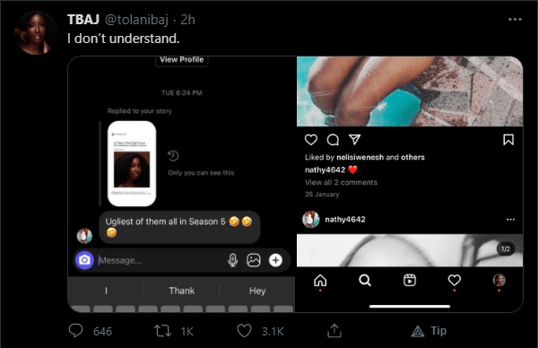 Tolanibaj who was super surprised at how a person can refer to their fellow human being as ugly also responded to the fan by showing her photos and attached the caption, “I don’t understand you”.