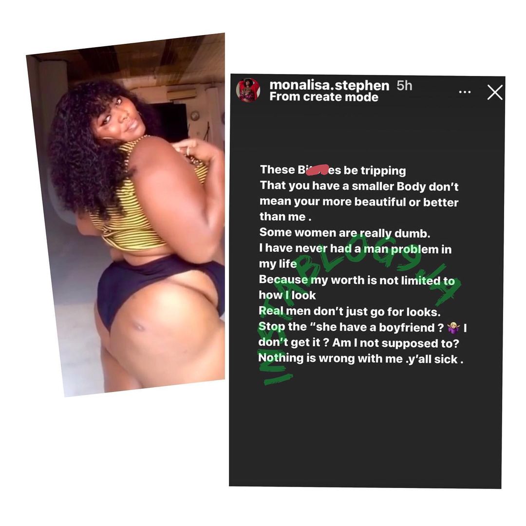 Monalisa Stephen has taken to social media and revealed that she has not had any problem with men in her life as far as her body is concerned.
