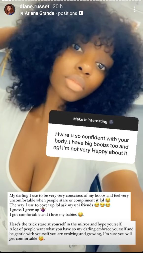 Former housemate of the Big Brother Naija season four Diane Russet has taken to social media and revealed that she used to be very conscious of her melons because of the compliments people made about it.