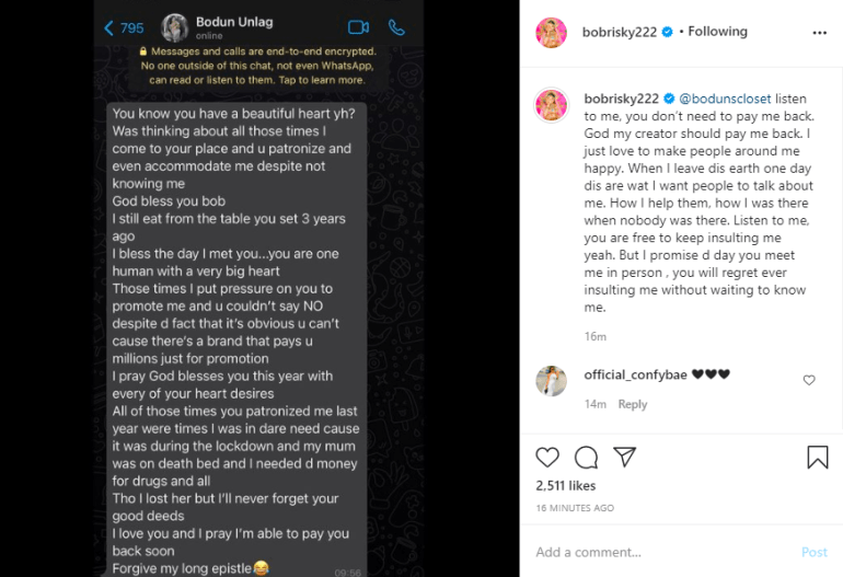 The popular Nigerian crossdresser took to his official Instagram handle and shared the screenshot, and according to the chat, the individual identified as Bodun Unlag seemed very grateful for what Bobrisky did, and so she showered Okuneye Idris Olanrewaju, better known as Bobrisky, with praises.