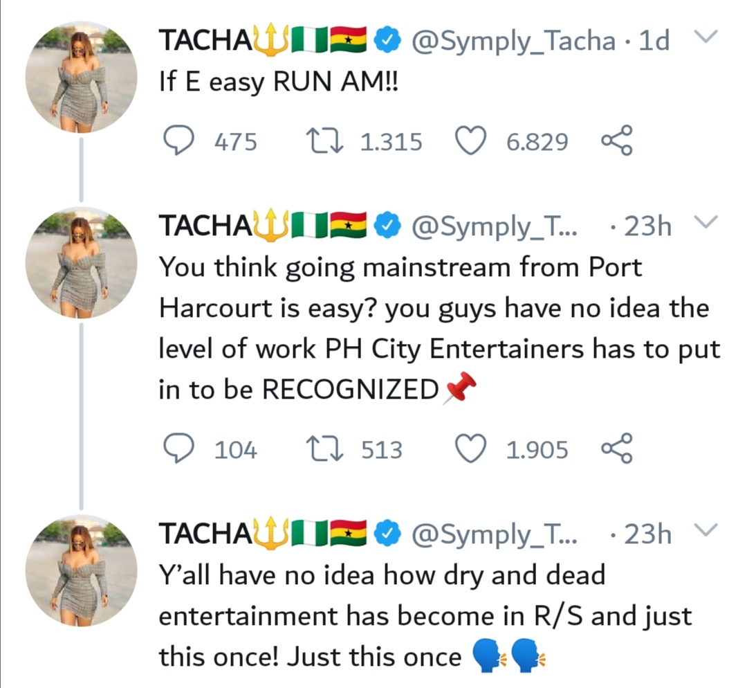 According to Tacha, being able to be a mainstream artist from Port Harcourt is not easy “you guys have no idea the level of work PH City Entertainers has to put in to be RECOGNIZED”, she said.