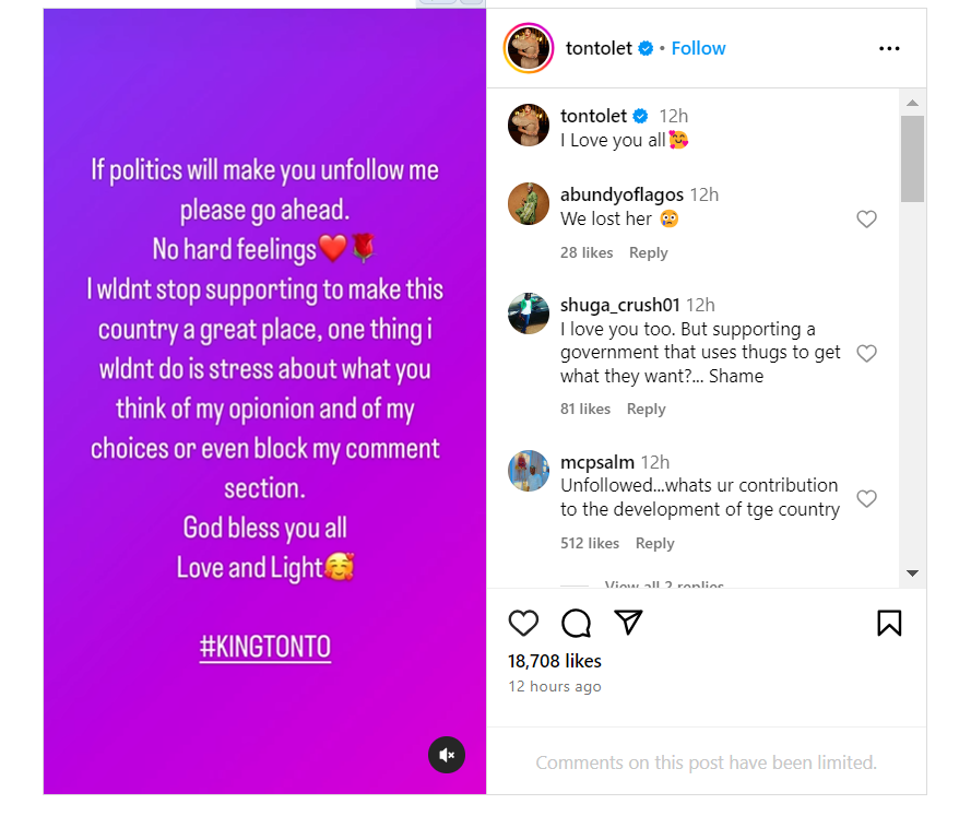 “If politics will make you unfollow me, please go ahead. I have no hard feelings; I wouldn’t stop supporting to make this country a great place. One thing i wouldn’t do is stress about what you think of my opinion and of my choices or even block my comment section. God bless you all with love and light, #KINGTONTO.”