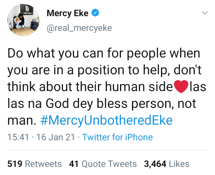 Do what you can for people when you are in a position to help, don’t think about their human side las na God dey bless person, not man. #MercyUnbotheredEke,” she tweeted.