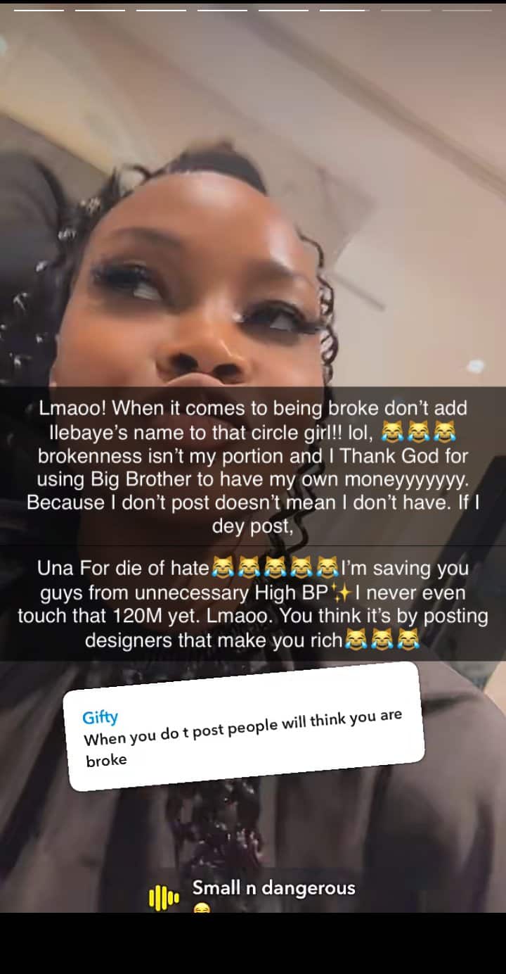 “Lmaoo! When it comes to being broke, don’t add Ilebaye’s name to that circle girl! lol, brokenness isn’t my portion and I thank God for using Big Brother to have my own money. Because I don’t post doesn’t mean I don’t have. If I dey post, una for die of hate. I’m saving you guys from unnecessary High BP. I never even touch that 120M yet. Lmao you think it’s by posting designers that make you rich,” she said.