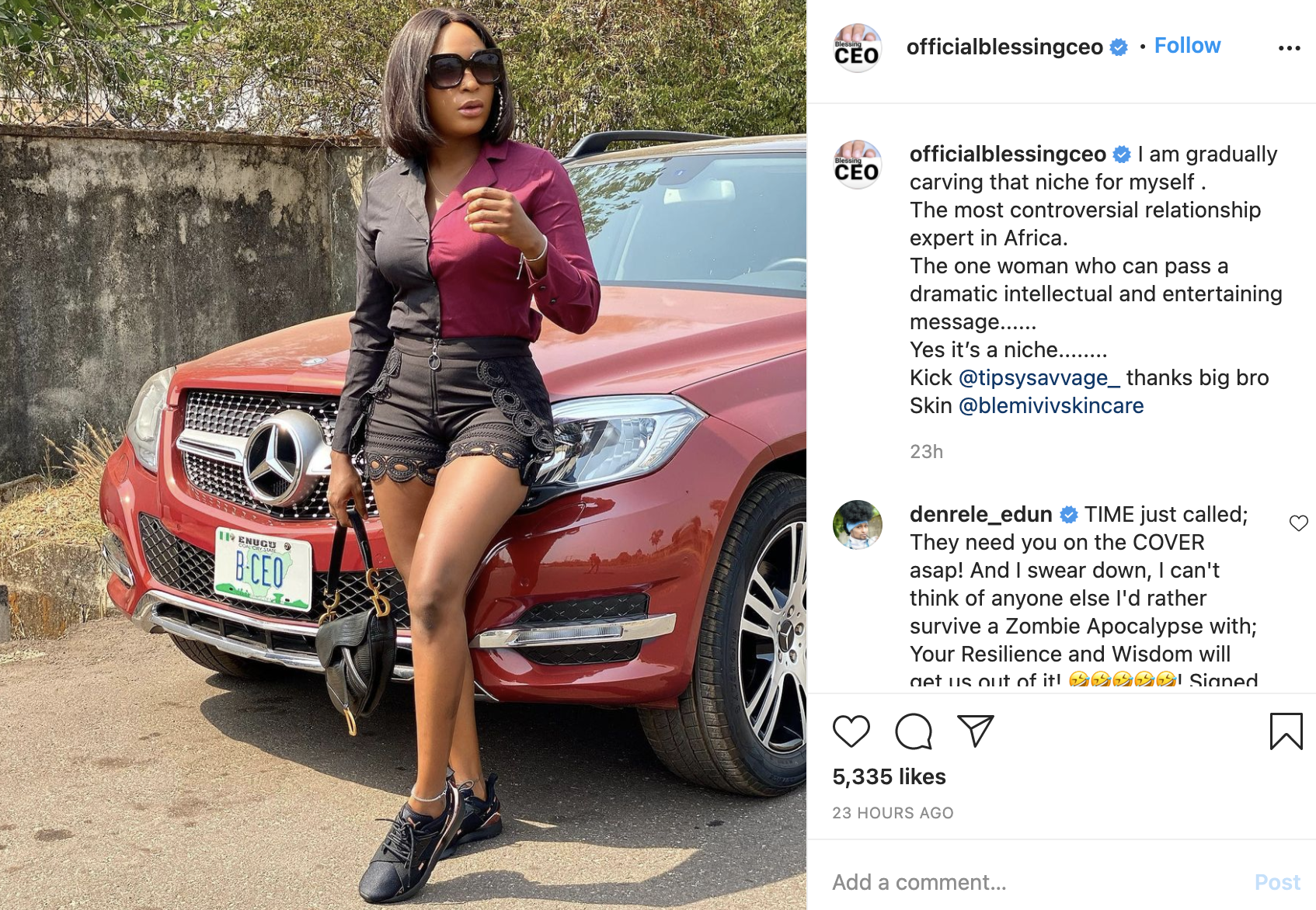 The controversial Nigerian relationship expert took to her official verified Instagram handle and shared a photo of herself and stated that she is gradually becoming the most controversial relationship expert in Africa.