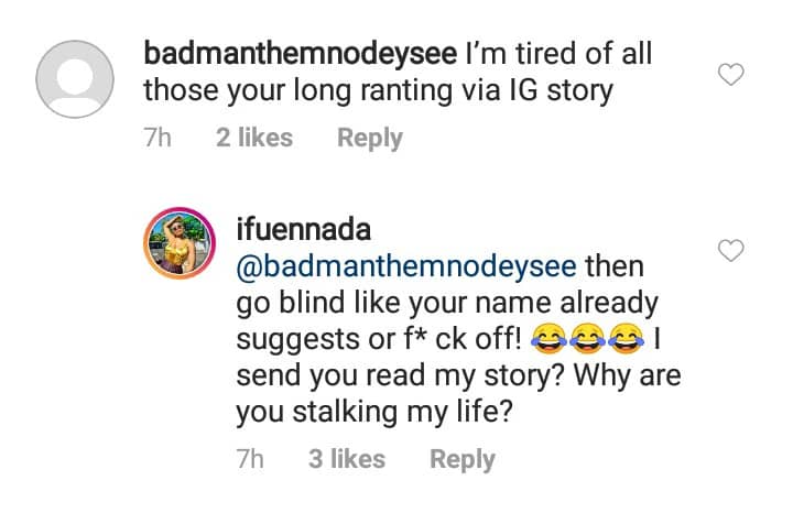 “I’m tired of all those your long ranting via IG story,” the fan wrote. Ifu Ennada replied to the fan by saying; “then go blind like your name already suggests or f*ck off! I send you read my story? why are you stalking my life?”