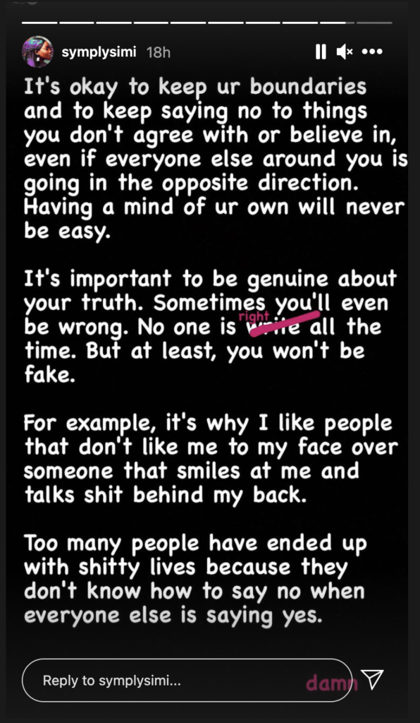 She wrote, “It’s okay to keep ur boundaries and to keep saying no to things you don’t agree with or believe in, even if everyone else around you is going in the opposite direction. Having a mind of ur own will never be easy.