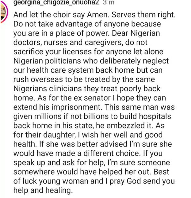 As for the ex senator I hope they can extend his imprisonment. This same man was given millions if not billions to build hospitals back home in his state, he embezzled it. As for their daughter, I wish her well and good health. If she was better advised I’m sure she would have made a different choice.