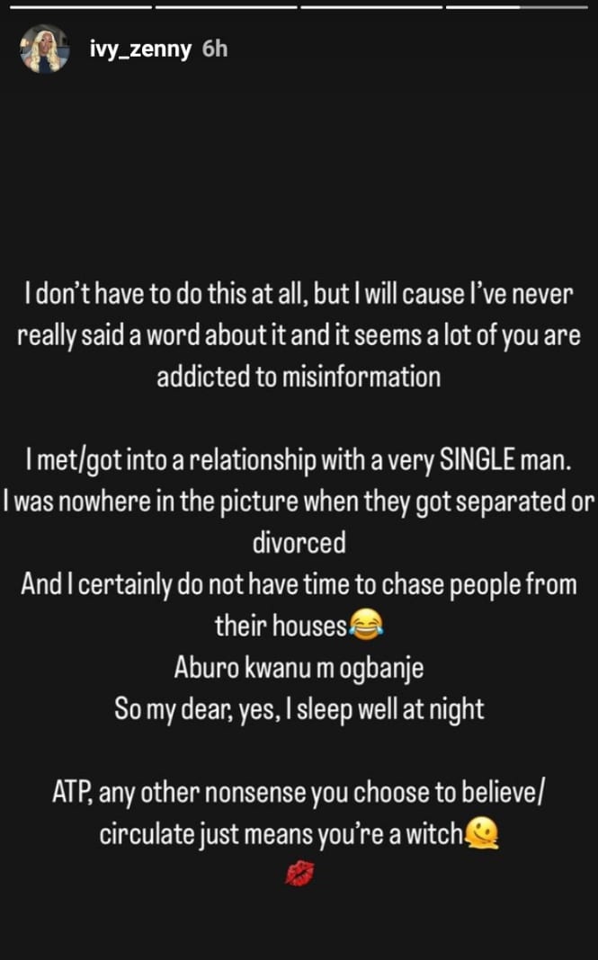 Ivy expressed her frustration with the misinformation, stating, “I don’t have to do this at all, but I will cause I’ve never really said a word about it and it seems a lot of you are addicted to misinformation. I met/got into a relationship with a very SINGLE man. I was nowhere in the picture when they got separated or divorced. And I certainly do not have time to chase people from their houses Aburo kwanu m ogbanje. So my dear, yes, I sleep well at night. ATP, any other nonsense you choose to believe/ circulate just means you’re a witch.”