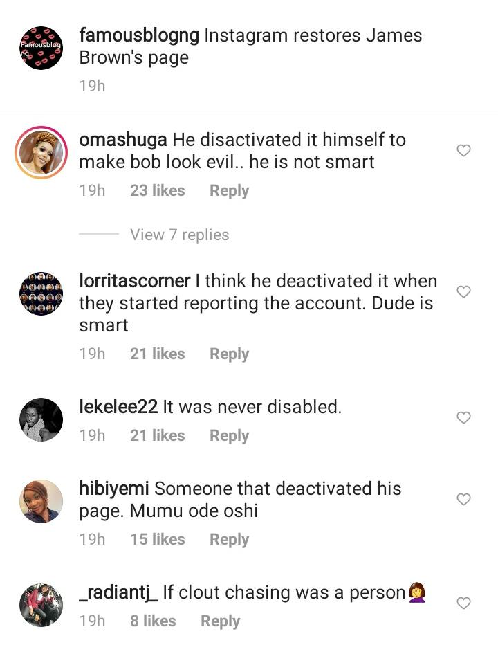 However, James Brown’s Instagram account restore in less than 24 hours. Social media users reacting to this said he disabled his own page for a while just to chase Clout and also make his former boss Bobrisky look bad as some were also saying he did that to save his page from being deleted because people were reporting his page.