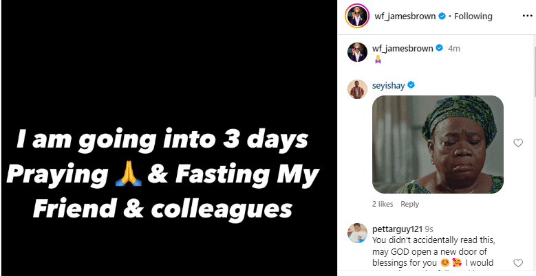 In a now-deleted post, James Brown stated: “I am going into 3 days praying and fasting my friend and colleagues.”