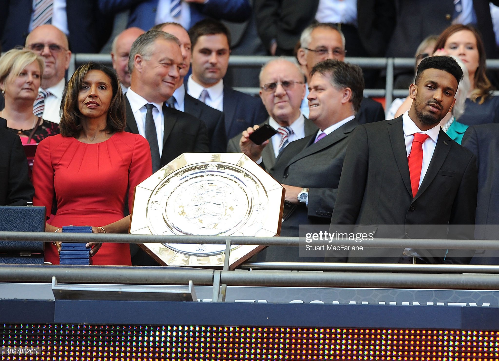 LONDON, ENGLAND – AUGUST 02: (L) Janet Rocastle, wife of Arsenal legend David and son (R) Ryan prepare for the trophy presentation after the FA Community Shield match between Chelsea and Arsenal at Wembley Stadium on August 2, 2015 in London, England. (Photo by Stuart MacFarlane/Arsenal FC via Getty Images)