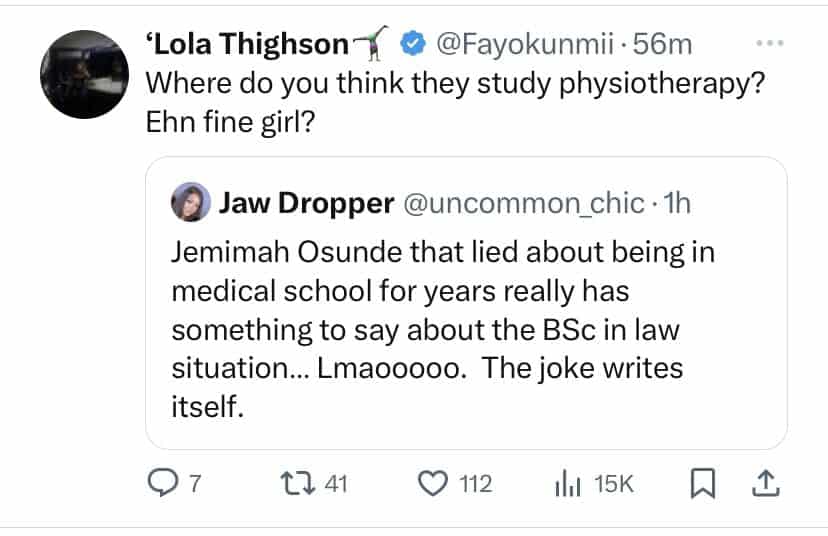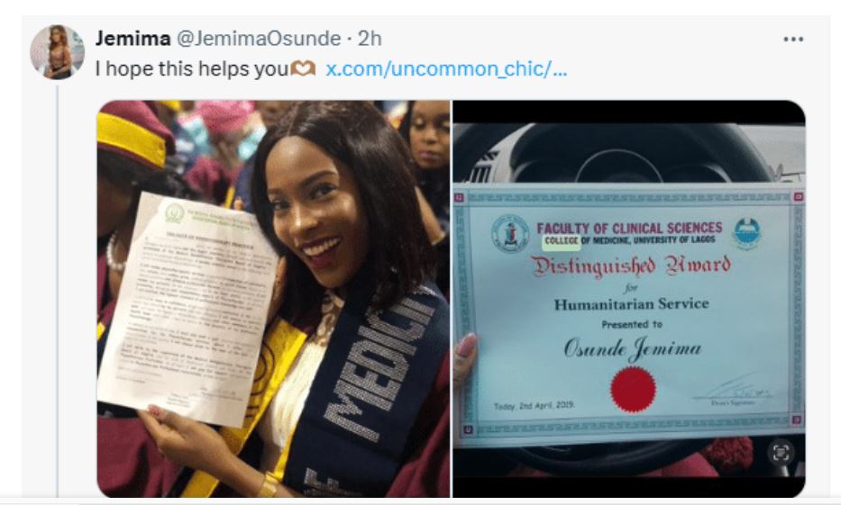 In response to these allegations, Jemima Osunde took to her social media platforms to address the doubts surrounding her academic credentials. She shared a photo from her induction ceremony alongside her degree certificate from the College of Medicine, University of Lagos, validating her education and confirming her attainment of a degree in Physiotherapy.