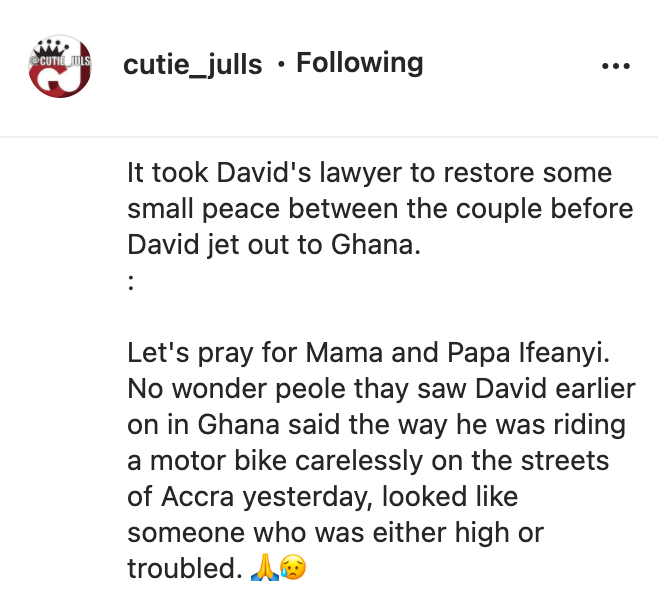 Let’s pray for Mama and Papa Ifeanyi. No wonder peole thay saw David earlier on in Ghana said the way he was riding a motor bike carelessly on the streets of Accra yesterday, looked like someone who was either high or troubled. ??” Cutie Julls wrote.