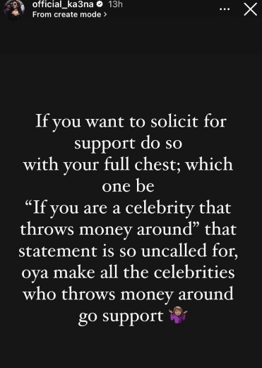 However, in a recent post on her social media page, Ka3na indirectly criticized Korra Obidi for her approach, suggesting that she should have simply asked for support without making such statements.