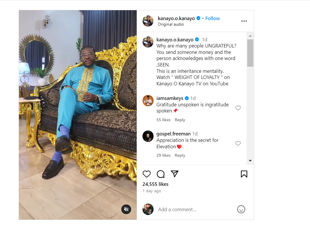 Veteran Nigerian actor Kanayo O. Kanayo has spoken out against what he sees as a growing trend of ingratitude in society. On July 8, 2024, the respected performer took to Instagram to share his thoughts on the matter, sparking a conversation about gratitude and social etiquette.