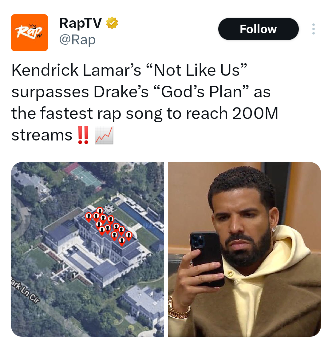 The song, which throws shade at Drake, has now outpaced Drake’s hit “God’s Plan” by becoming the quickest rap song to amass 200 million streams on Spotify. This feat was accomplished in just 19 days, as reported by RapTV on X, the platform previously known as Twitter.