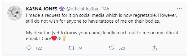 ”I made a request for it on social media which is now regrettable. However, I still do not wish for anyone to have tattoos of me on their bodies.