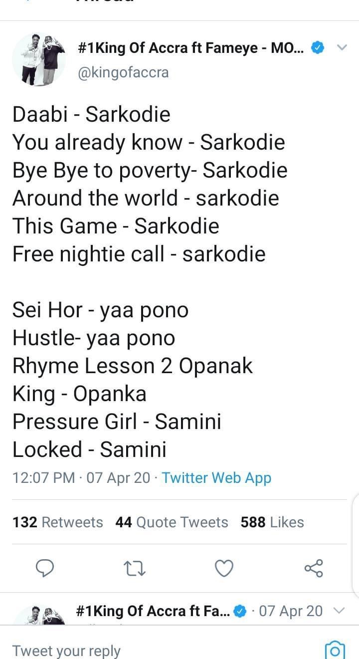 King of Accra lists, rap superstar, Sarkodie lead the lists with six songs which are”Daabi, You Already Know, Bye Bye To Poverty, Around The World, This Game and Free Nightie Call. He also mentioned Yaa Pono with ”Seiho and Hustle” and Samini with ”Pressure Girl and Locked”. The other artiste is Opanka with ”King and Rhyme Lesson”.