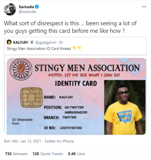 This is to tell you that Sarkodie has finally accepted that he is stingy and was expecting to be the first man to get the identification card of the newly launched “Stingy Men Association”.